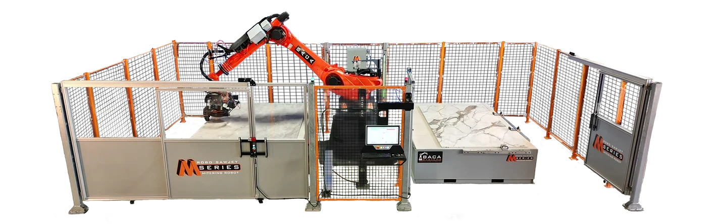 The M Series is an advanced cutting machine that offers full mitering capabilities in a single unit, accommodating both sawblade and waterjet mitering. With a generous saw and jet mitering envelope, it handles super jumbo slabs effortlessly. Utilizing efficient programming through Alphacam with BACA’s custom toolbar makes programming easy, precise multi-point slab thickness adjustment for mitering, and a remarkable patent pending auto-calibration